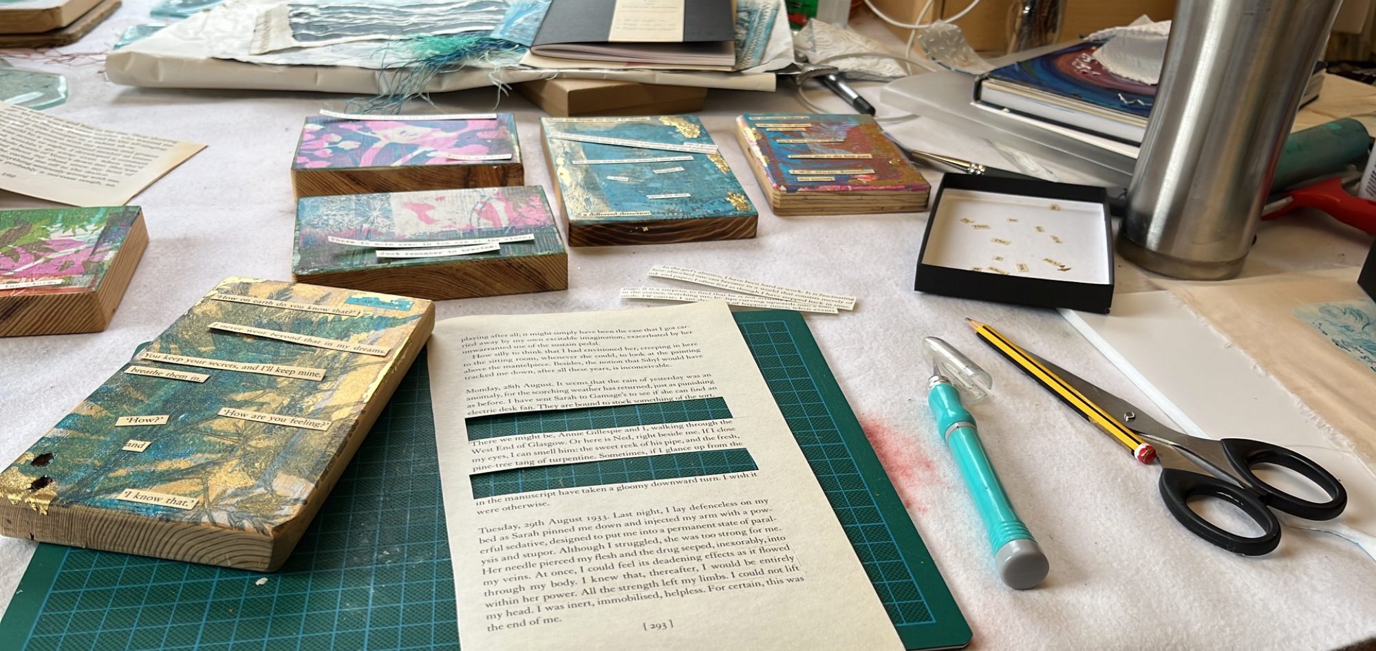 From her small studio in Dorset, Kate works with reclaimed glass mostly from old and broken greenhouses, rescued book pages, and found objects — including ocean plastics collected along the Jurassic Coast during her regular beach walks. Driftwood gathered from the shore often becomes the foundation for her glass creations, grounding her work in the very environment that inspires it.